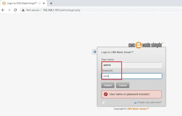 As can be seen in highlighted area of the above screenshot, our target machine is running a CMS-based website. The name of the CMS is “CMS Made Simple” and the running version is 2.2.13.