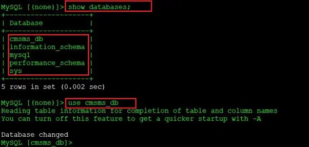 After gaining access to the database, first we used the show databases; command, which lists all the available databases on the server. Then we used the use command to enter the selected database. As we know that the application name is CMS, we selected the cmsms_db.