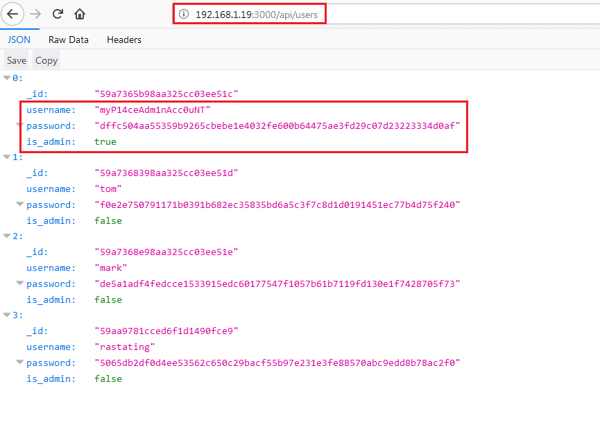 As you can see, we have hit the jackpot this time! We can see some username and password hashes on the identified URL, but all of them are normal users because is_admin is showing false.
