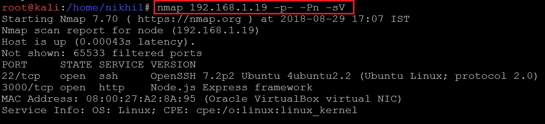 After the completion of the scan, we found two open ports on the target machine. SSH service was available on port 22, and the HTTP server was available on port 3000.