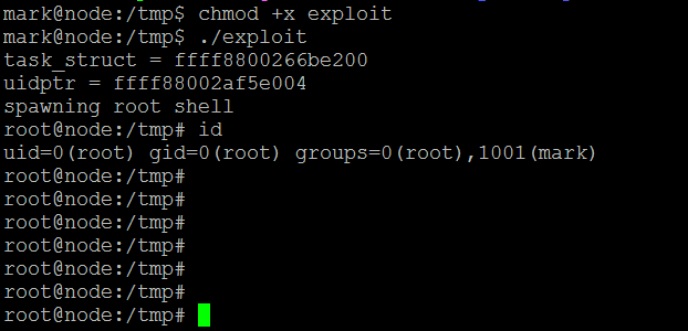 User “Mark” did not have write permission in the home directory, so I changed the current directory to “tmp” and used the wget utility to download the exploit on the target machine. Once the exploit has been downloaded, I used the GCC complier to compile the exploit; after the compilation, it generated an executable which can be seen in the above screenshot.