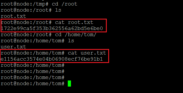 So I started to hunt for the flags. After some time I found the “root” flag in the root directory. Another flag was found in the “tom” user’s home directory. Both flags can be seen in the following screenshot.