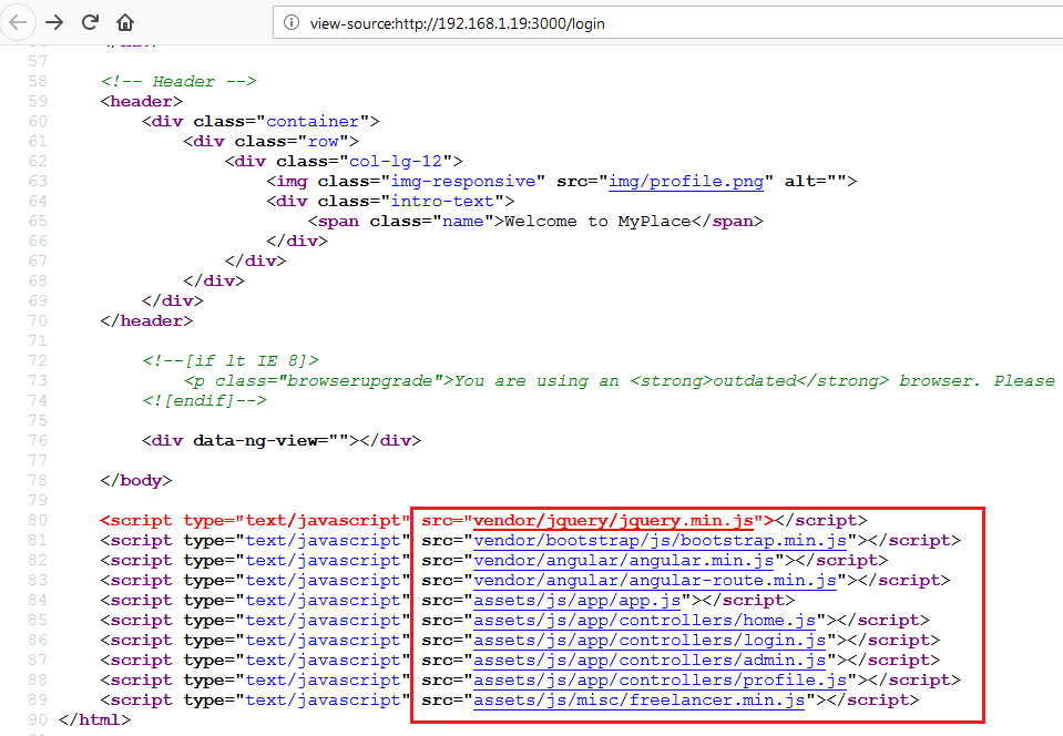 After that, I decided to manually analyze the HTML content of the application for any clue. First, I checked the HTML content of the index page and found some JavaScripts, which can be seen in the following screenshot.