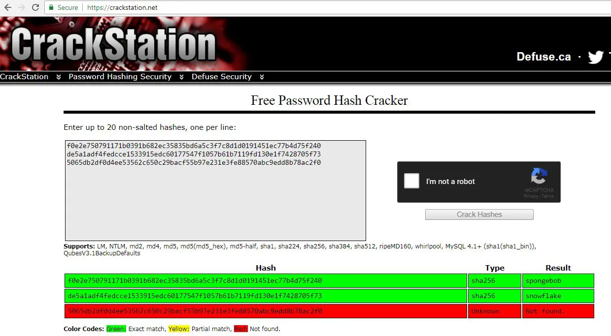 Now let’s try to crack these password hashes. For that, I used the online password cracker website Crack Station. It was quite easy to use: We just need to enter all the hashes on the website and click on the Crack button. If there is a weak password used by the user, it will be cracked by the website.