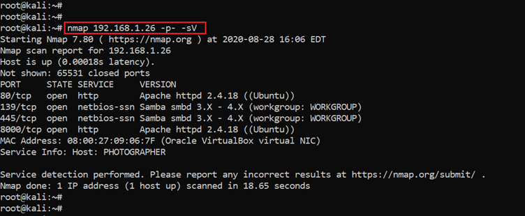 In the output of the Nmap scan, we can see four ports on the target machine that have been identified as open. In the Nmap command, we used the -sV switch for version enumeration. We also used the -p- option for full port scan. It tells Nmap to conduct the scan on all the 65,535 ports on the target machine. By default, Nmap conducts the scan only on known 1,024 ports. So, it is especially important to conduct a full port scan during the pentest or solving the CTF for maximum results.