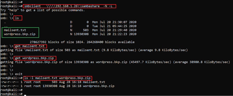 The highlighted area shows that first we used the ls command to see the contents of the sambashare folder. It was identified that there are two files available on the target machine; one is a text file, and another is a zip file. We further used the get command to download these files on our attacker machine, which can be seen in the below screenshot.