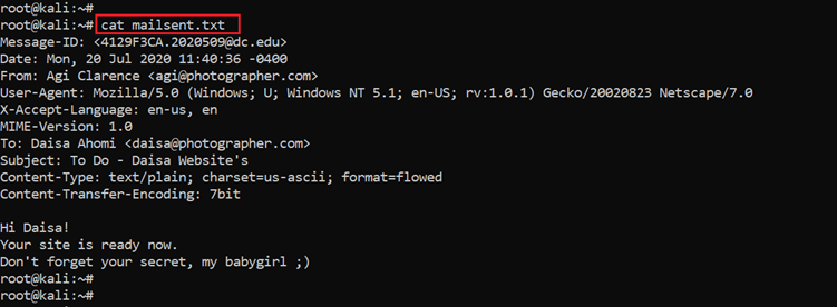 Here, we can see that when we opened the “mailsent.txt” file, there was an email from where we got two email IDs. There is secret message that was sent in that email: it could possibly be “my babygirl” or just “babygirl”. As of now, we do not have a login page, so let’s just keep this information for later use.