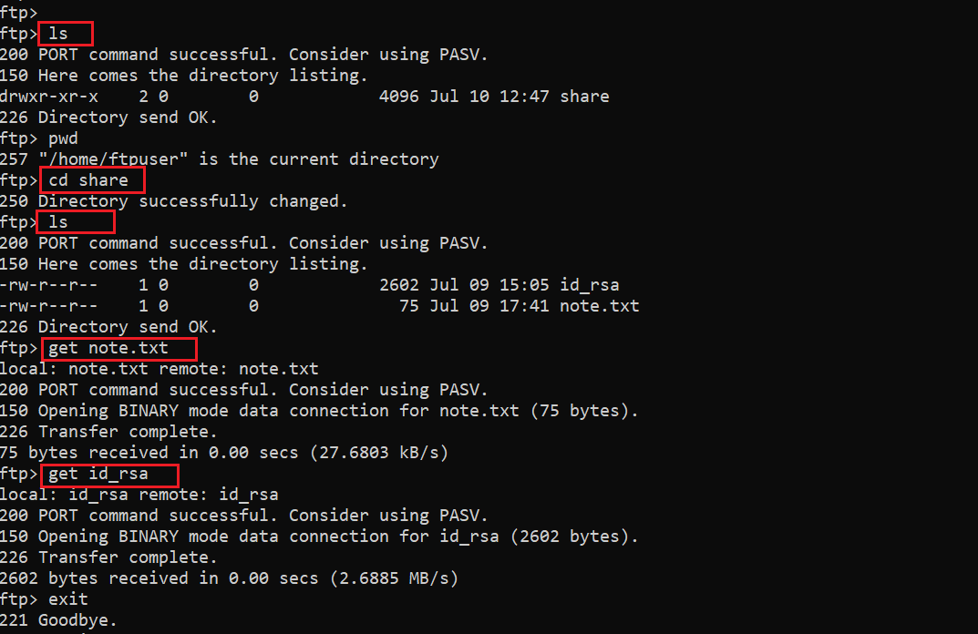 As we know the SSH port was also open on the target machine, so we can use the private key to log in on our target machine. There is a username mentioned in the note.txt file; let’s identify more usernames for SSH logins. We checked all the folders with FTP users and in the home directory we found some usernames, which can be seen in the following screenshot.