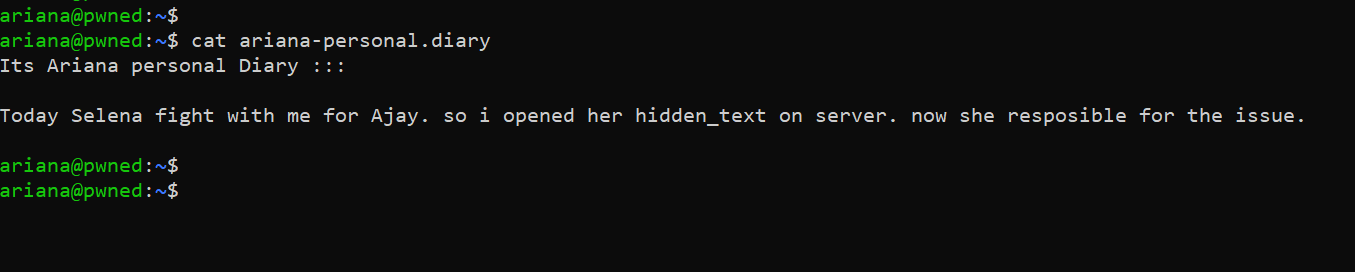 In the above screenshot, we can see that the username “Ariana” worked and we are successfully logged into the target machine through SSH. We found the first flag in the home directory: