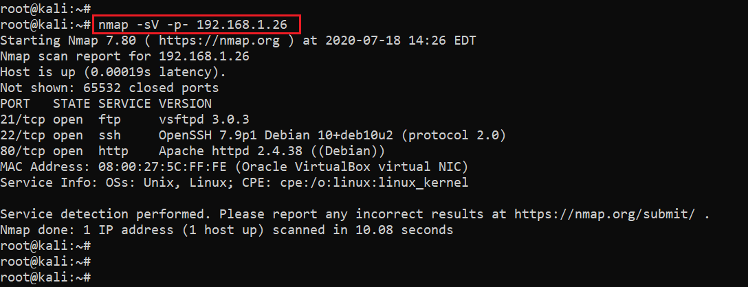 In the output, we can see three ports on the target machine that have been identified as Open by the full port scan. In the nmap command, we used the -sV switch for version enumeration. We also used the -p- option for a full port scan. It tells Nmap to conduct the scan on all 65,535 ports on the target machine. By default, Nmap conducts the scan only on known 1024 ports. Therefore, it is especially important to conduct a full port scan during the pentest or solving the CTF for maximum results.