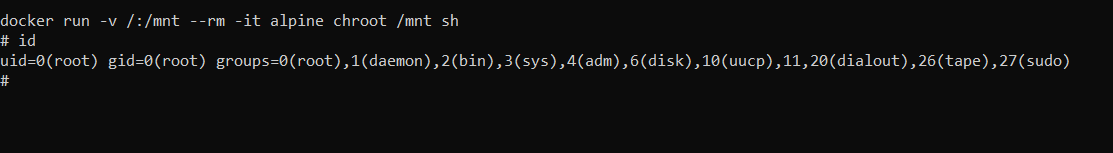 Command used: docker run -v /:/mnt –rm -it alpine chroot /mnt sh