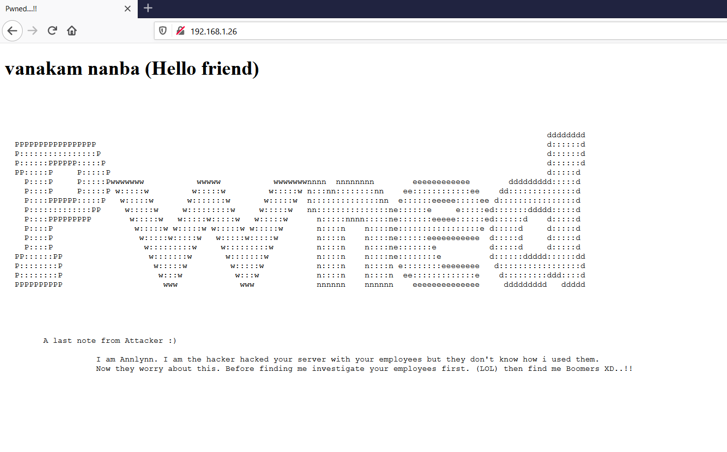 We can see a default page on the website with a nice Pwned design. There is also a note from the attacker: “I am Annlynn. I am the hacker hacked your server with your employees but they don’t know how I used them” ... blah, blah.