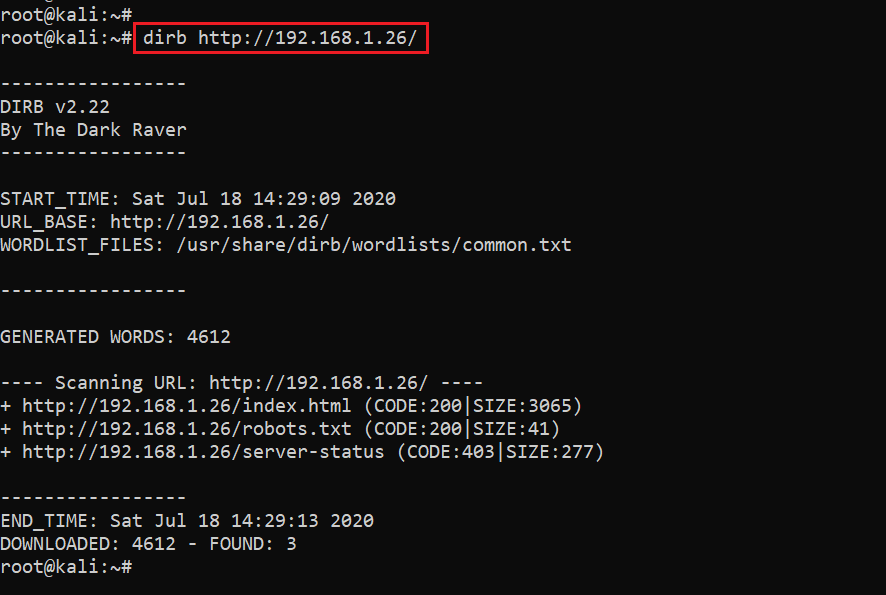 The Dirb output shows that only three files have been identified by the tool. I checked the robots.txt file but it does not give us any helpful clues. So, I decided to run Dirbuster for more detailed enumeration on the target machine website. The output of the dirbuster command can be seen below.