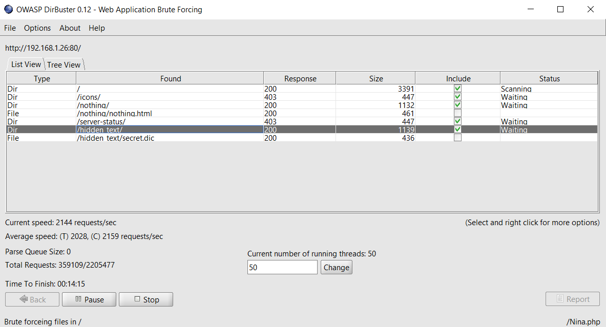 The Dirbuster scan took some time to complete, but it was worth the wait. After waiting for 5 to 10 minutes, it shows a “hidden_test” directory on the target website, which can be seen in the highlighted area above.