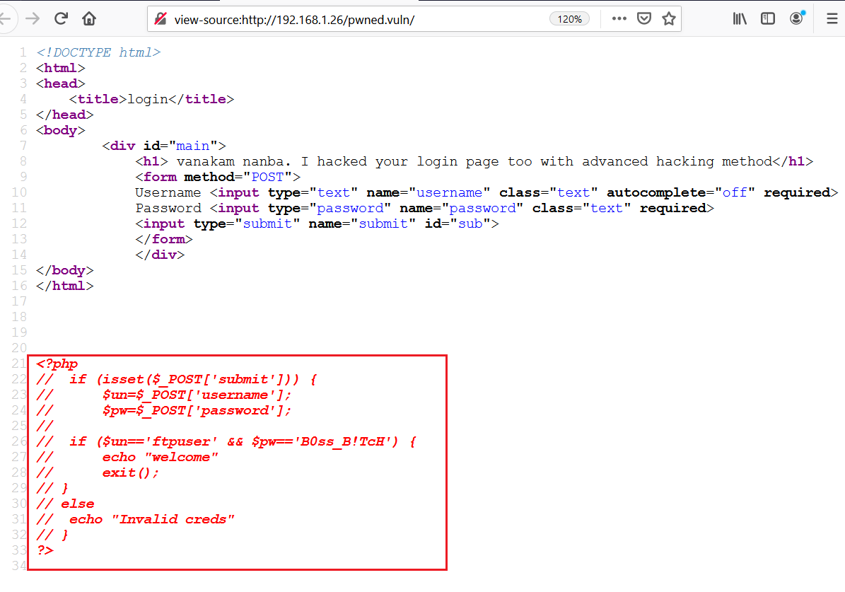 When I checked the HTML content of the page, I found a PHP source code embedded in the HTML page which contains the FTP username and password. It can be seen in the following screenshot.