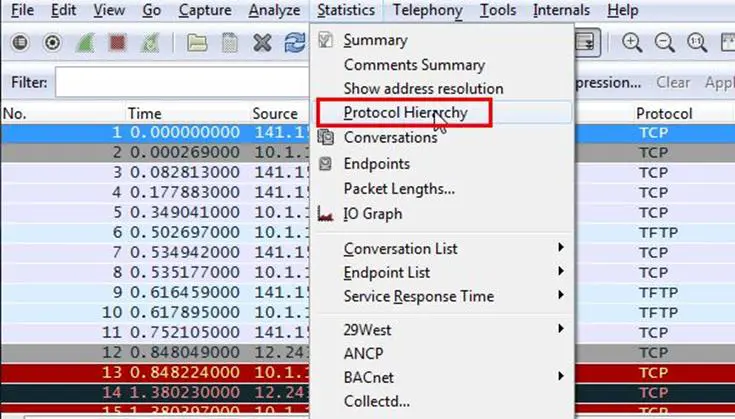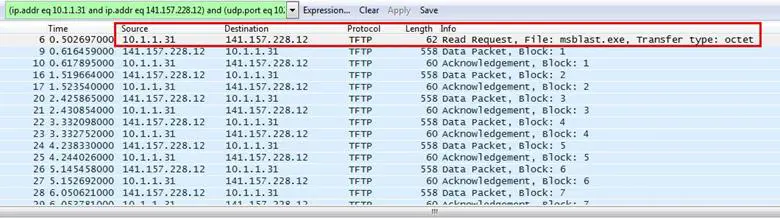 Analysis – First, we applied the filter for TFTP application, and as can be seen, there is an exe file, mblast.exe, which is transmitting to 10.1.1.31.