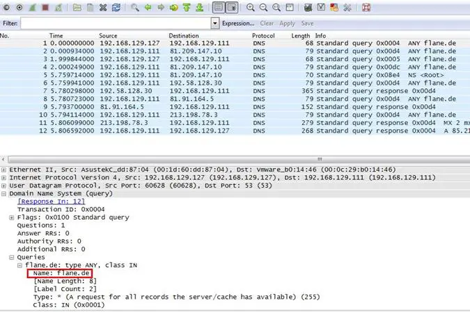 Analysis - Open any packet and expand the Domain Name System tab, and as can be seen below, the DNS query is going for flane.de.