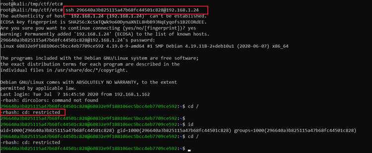 The above screenshot shows that we are able to log into the target machine. However, when we try to run commands on the system to explore various directories, none of the commands worked and an error message showed that the user is configured to use the rbash shell, which is a restricted shell. This means we’ll first have to bypass it to run further commands and explore the target machine.