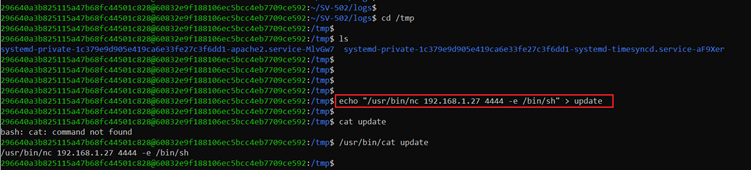 First, we changed our current directory to the tmp directory by using the cd command. After that, we used the echo command to add the reverse shell command into the update file.