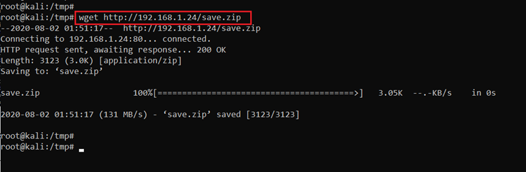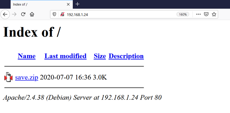 As can be seen above, when we opened the IP address in the browser, we could see the files on the server as directory listing was enabled on our target machine. There was one compressed file available on the target machine. The file “save.zip” can be easily downloaded for further analysis.
