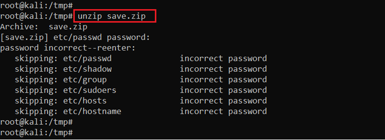 I tried some commonly-used passwords to unzip the file, but none of them seem to be working here. In the next step, we will be using the John the Ripper tool for cracking the password of the zip file.