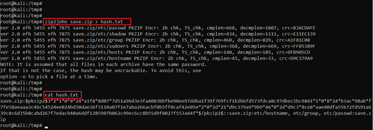 As we can see, first we used the ziptojohn utility to extract the zip file password hash into the hash.txt file. The output of the command shows that our command was successfully executed. After that, we use the cat command to view the password hash.