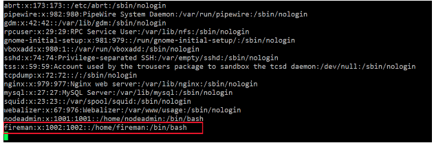 After spending some time and exploring the target machine with the limited shell, I found that there is another user in the target system. This user is called “fireman.” I identified it by analyzing the “/etc/password” file. It can also be seen in the highlighted area in the following screenshot.