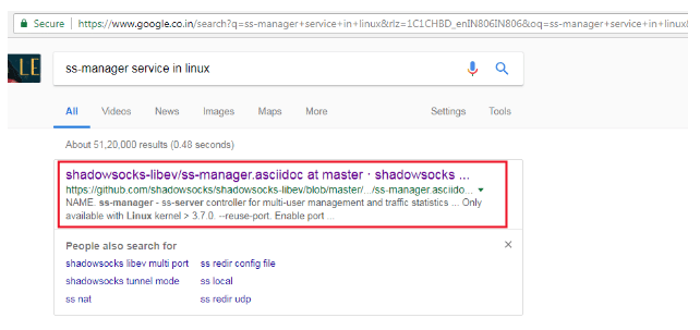 In the highlighted area we can see that there is a service called “ss-manager” which is being run as sudo user. When we searched for this service on Google, we found that it belongs to the “shadowsocks-libev” package, which is generally used as a controller for multi-user management and traffic statistics. It can be seen in the following screenshot.