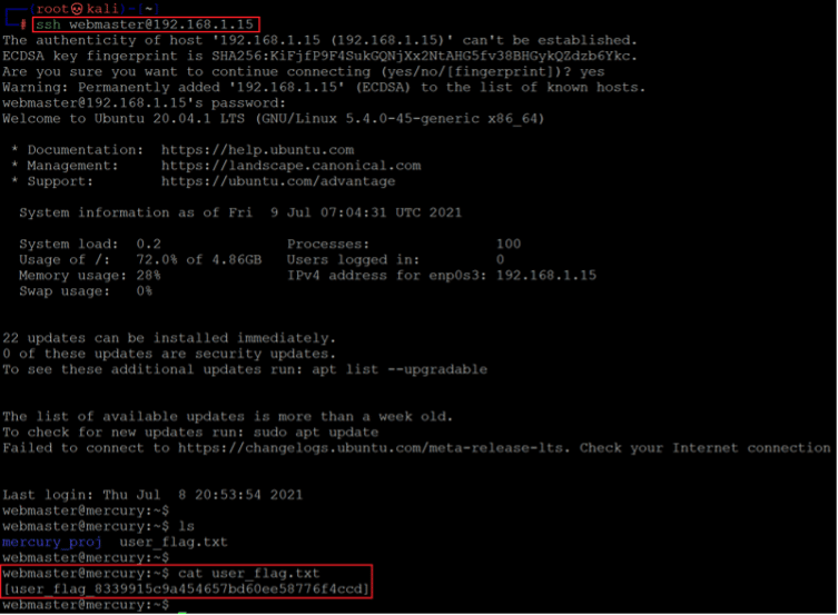 We are now logged into the target machine as user' webmaster.' After the login, we got our first flag in the same directory. Since this is not the root user, let's identify further information about the target machine, which could be useful for gaining root access.