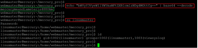 echo "bWVyY3VyeW1lYW5kaWFtZXRlcmlzNDg4MGttCg==" | base64 –decode