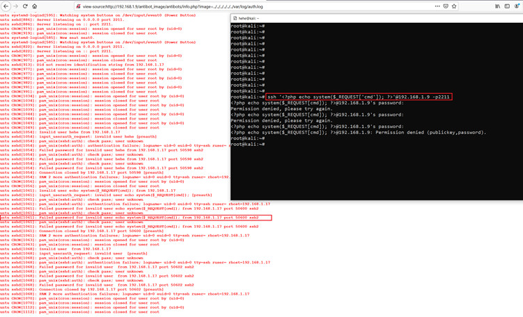As we can see in the above screenshot, we tried to log in with a random user with SSH and provided a random password. At the same time, we checked the logs for usernames and the highlighted area shows that we got the username in the logs. We can use this feature for writing files on our target system and then we can use it for executing the code. First, write command in logs by logging into SSH, shown in the following screenshot: