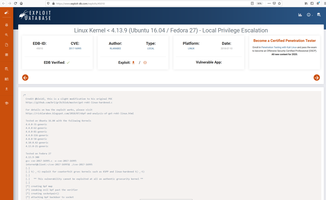 As can be seen above, there are a lot of exploits available for the currently installed kernel version. As our goal is to gain root access of the target machine, we decided to use the privilege escalation exploit for our purpose. The exploit-db URL for the vulnerability can be seen in the screenshot given below: