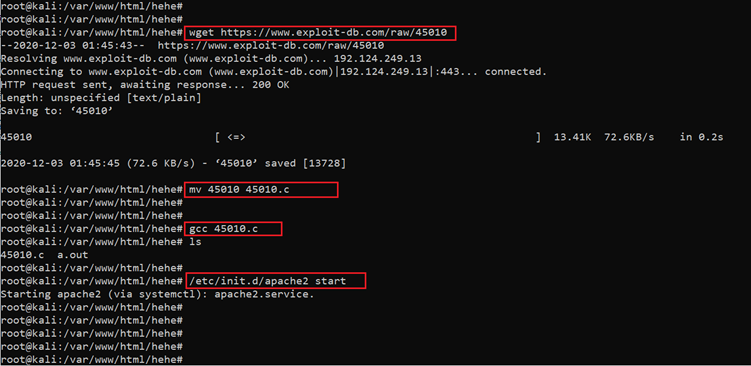 After reading the exploit description, we found that it was written in C, but C Compiler was not available on our target machine. First, I downloaded the exploit on my local machine and compiled it using a C Compiler and transferred it into the attacker machine by using the wget utility, which can be seen in the following screenshot: