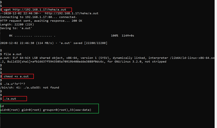 In the above screenshot, after downloading the exploit on the target machine, we gave executable permission to the ‘a.out’ file using chmod. After that, we executed the payload on the target machine. As per the exploit description, successful execution should provide root access on the target machine. We verified the current user by the ‘id’ command and found that the user has changed to root.