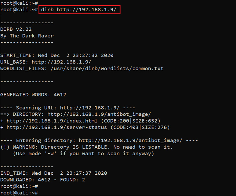 As we can see, we got a picture of a tomato on the browser and no other functionality could be found. We decided to explore this port further by searching for hidden files and folders on the target machine. This can be done with the help of automated enumeration tools. We used the DIRB tool for this purpose, which is an effective utility to enumerate files and folders and is available by default on Kali Linux. The scan command and output can be seen below: