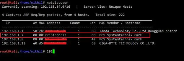 After downloading and running this machine in Virtual Box, we start by running the Netdiscover command to obtain the IP address of the target machine. The command and its output can be seen in the screenshot given below: