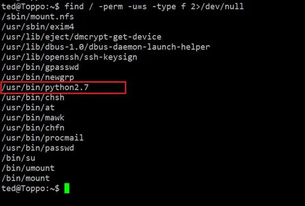 One of the interesting binaries which we found was Python, which can also be seen in the highlighted area of the above screenshot. So now we can use this to escalate the privilege of the user to get the root access of the target machine.