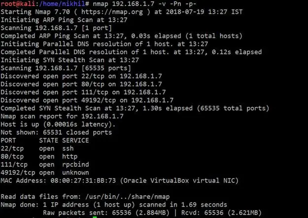 So we have the target machine IP; the first step is to find out the ports and services that are available on the target machine. An Nmap full port scan is used for this purpose. This is illustrated in the screenshot given below: