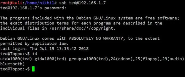 These credentials allowed us to log into the target machine. The successful SSH login can be seen in the following screenshot.