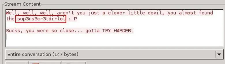 In one of the connections, we found a message that "you almost found the sup3rs3cretdirlol". A directory is what the message denotes.