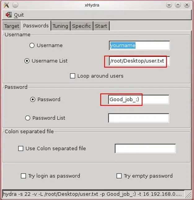 Now what to do? We have usernames and a password, it is quite easy to brute force. We fired up the Hydra brute forcer. As can be seen below, we put that username list in user.txt file and put the password as Good_job_:)