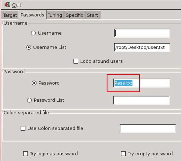 We started the attack and we weren't able to log in with this password. We tried to figure out what is wrong with the credentials. After some time, we noticed that the folder that contains the Pass.txt name was the folder that contains the password, so what if we use the password as Pass.txt. Again we configured the Hydra, this time the password is Pass.txt.
