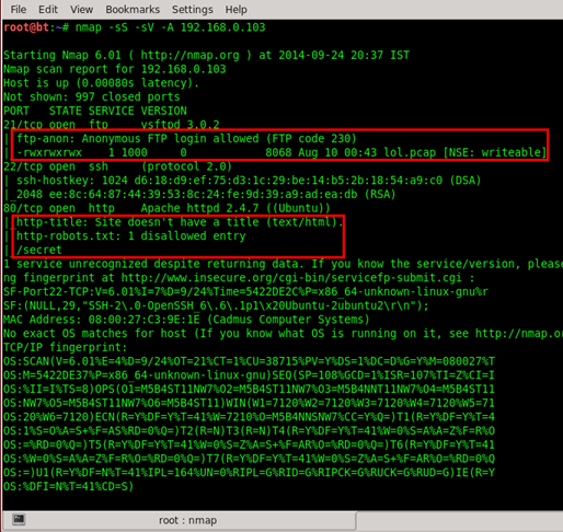The scan result: was of three ports FTP, SSH, and HTTP. We did a script-based Nmap scan by using -A argument, so we had some more details of those open ports. As can be seen below, in port no. 21, FTP is allowed to login as Anonymous user and it also contains a lol.pcap file in it, and port no. 80 HTTP service has a secret directory.