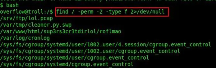 Our next step was to find all worldwritables files in the system, so we used find / -perm -2 -type f 2>/dev/null