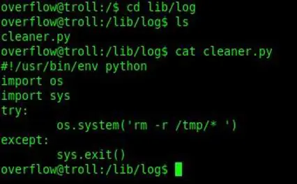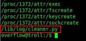 Found lots of files, but one file was unexpected: a Python file with writeable permissions. The file was located at /lib/log/cleaner.py.