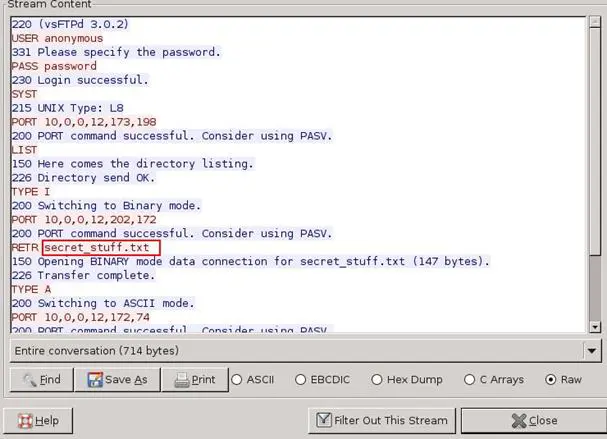 Then we opened the capture packet file from Wireshark and started to check all TCP connections by following TCP streams, and we found that a file named secret_stuff.txt has been transferred.