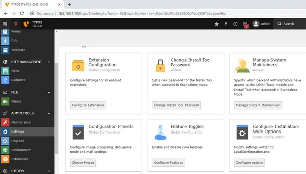 As we can see above, the login was successful, and we are able to access the Typo3 application as admin user.