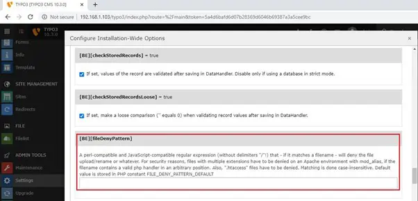 The first thing which we observed after the login is the Typo3 CMS version, which was 10.3.0. We checked the web for vulnerabilities in the CMS version but couldn’t find anything to exploit it.